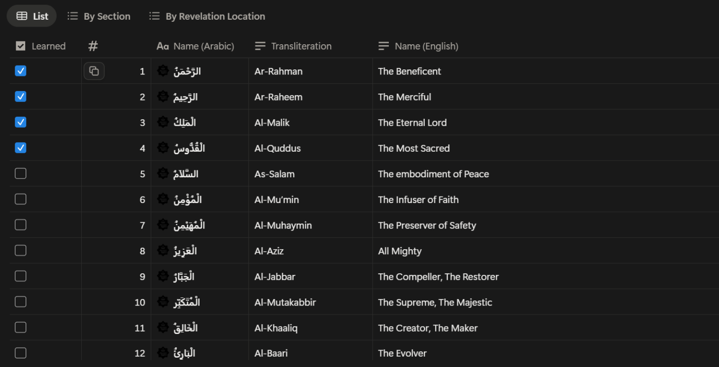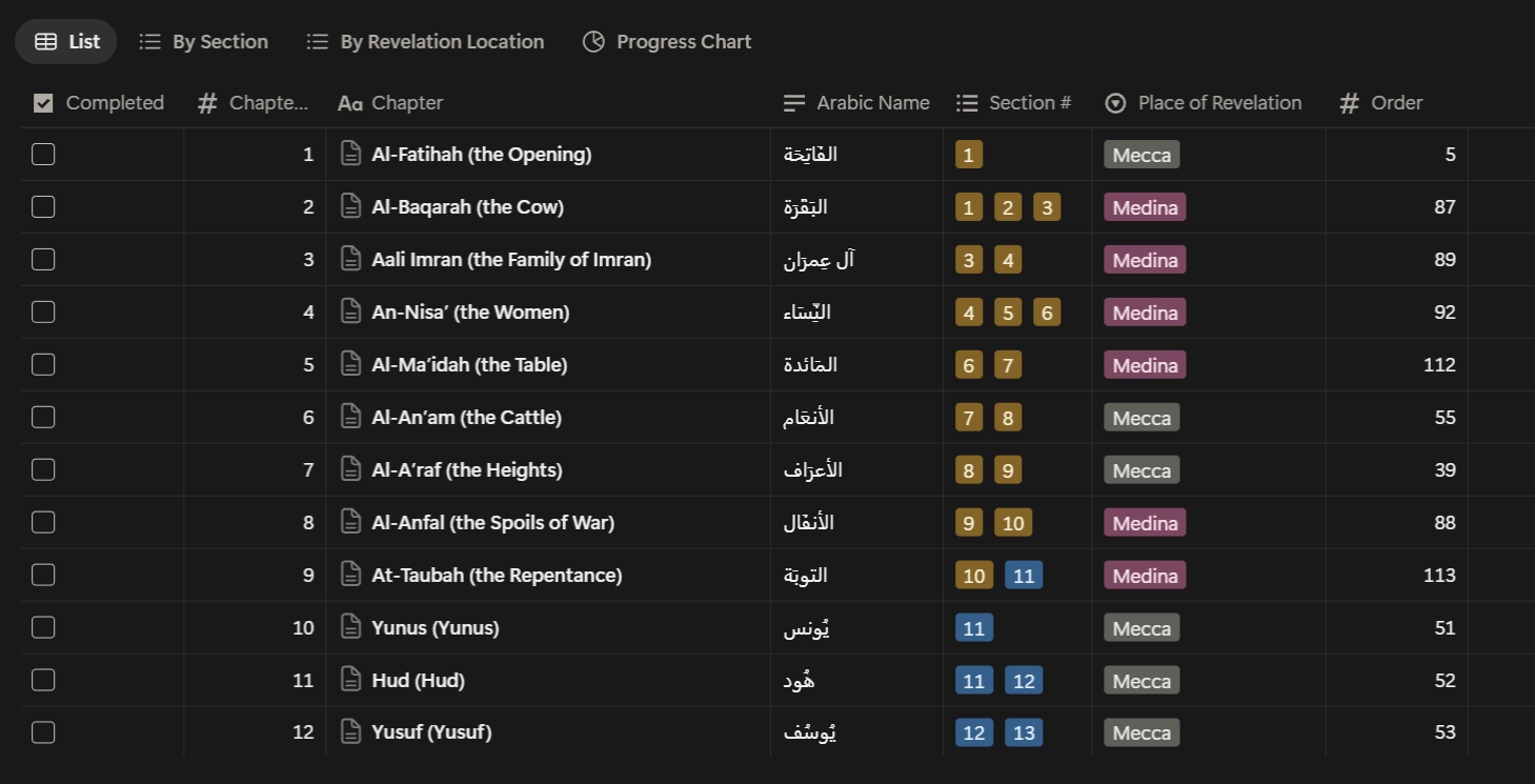 Track your Quran progress with structured notes by Surah and revelation context.