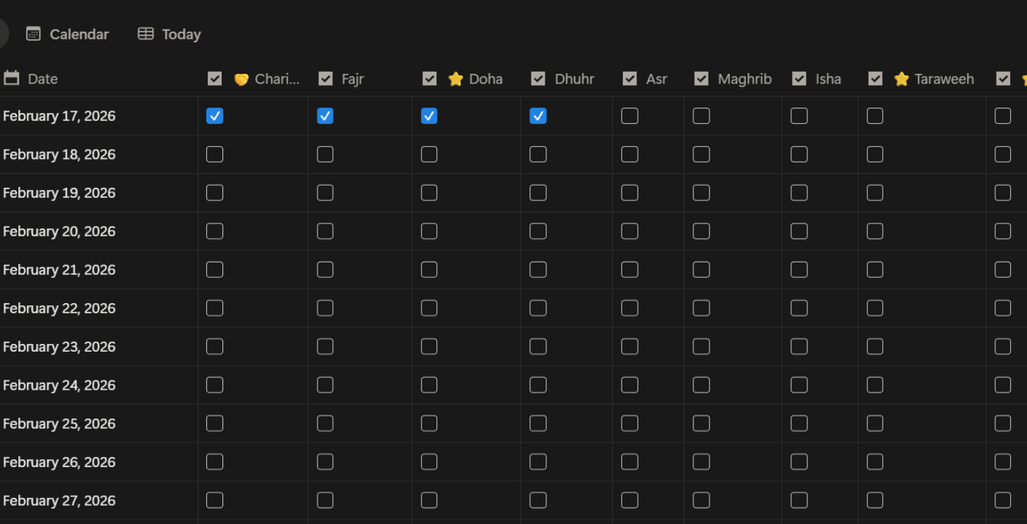 Monitor your five daily prayers, Taraweeh, and extra voluntary prayers.